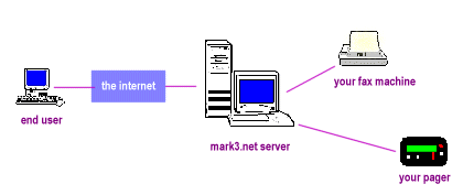 example: email to me@xxx.com will automatically get forwarded to 555-1212@fax.mark3.net, which will deliver the message to the fax machine at 555-1212.